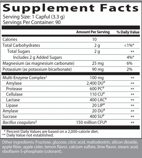 DigeZyme® is a multienzyme complex composed mainly of amylases (starch hydrolyzing enzymes), proteases (protein hydrolyzing enzymes) and lipases (lipid hydrolyzing enzymes). These digestive enzymes collectively support the breakdown of complex macromolecules into energy sources and promote the release of the nutrient content from the foods we eat. The digestive system naturally produces digestive enzymes. DigeZyme® supplements the gastrointestinal tract with enzymes to adequately support the body’s ability to digest food. In addition to the amylases, proteases, and lipases, DigeZyme® contains two additional digestive enzymes including lactase (lactose hydrolyzing enzyme) and cellulase (cellulose hydrolyzing enzyme).*